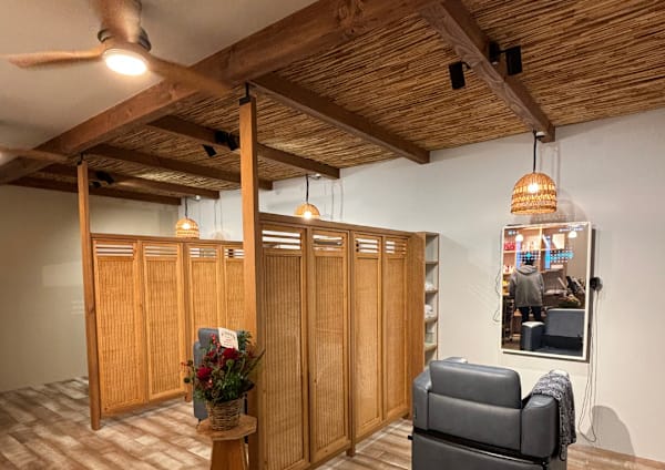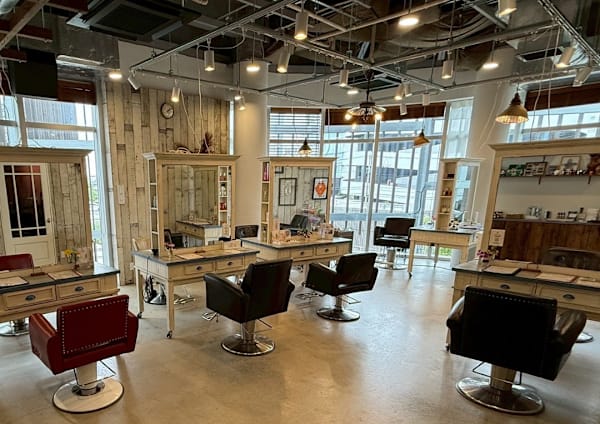 普通の美容室は施術する席が一列に並んでいて堅苦しいのですが、ここはランダムな配置で窓が開いていないにもかかわらず、なんとなく風が吹いているような、居心地のいい空間で、快適でした。