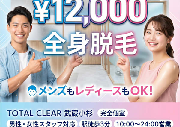 武蔵小杉エリアで数少ない深夜24時まで対応のトータルエステサロン。脱毛・フェイシャルなど、性別を問わず通える結果重視の施術をご提供。仕事終わりや予定後でも無理なく通える完全予約制。特許技術THR方式を採用し、1回でも変化を実感しやすい施術が特長です。忙しい大人のための通いやすさと結果を両立したサロン