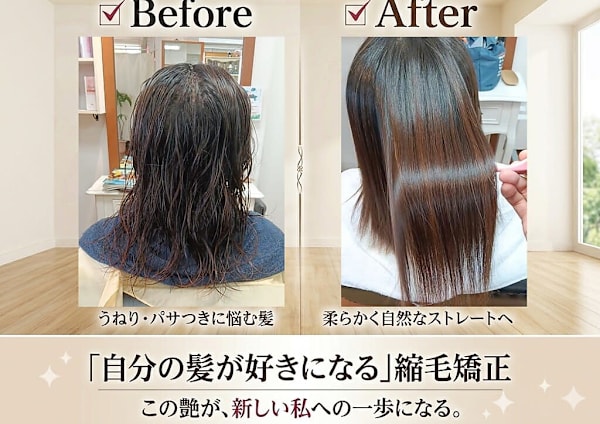 駐車場完備の便利なサロン。縮毛矯正技術が自慢。日常に溶け込むスタイル提案。忙しいあなたにぴったり。