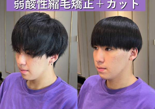 クセ毛・うねり・広がりに悩む男性のための、メンズ縮毛矯正専門店。弱酸性の薬剤で髪と頭皮に優しく、ナチュラルで扱いやすいストレートヘアを実現。ペタッとならず、清潔感のあるスタイルに。朝のセットも時短&快適に。自分史上最高の髪へ♩