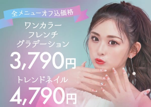 120店舗以上展開★年間70万人に利用されている日本No.1ネイルサロン★パラジェル変更385円/フィルイン変更330円の業界最安級価格♪付替えオフ料金は永久無料!ワンカラーorグラデーション3990円/定額デザイン4990円/持ち込みデザイン5990円と地域最安級★2回目以降もプチプラ◎