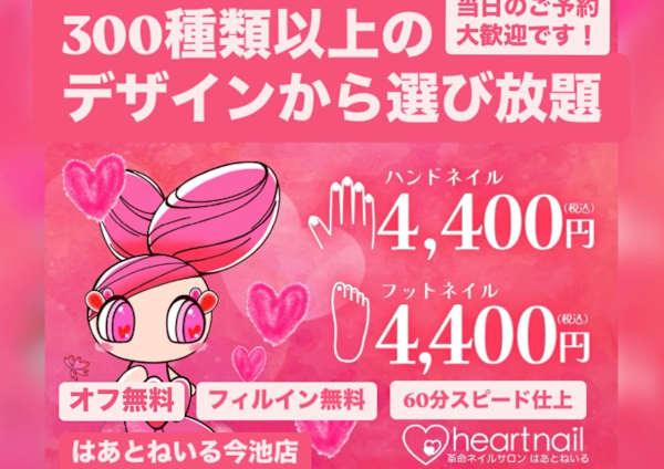 本日空きあり♪業界最安値【ハンド・フットも定額制350種類のデザイン全て4400円でオフも無料】