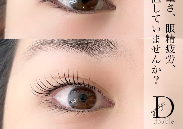 ダブルアイリフトは日々のPC・スマホの疲れ目、奥二重や一重、クマ、瞼のたるみなどをマッサージとまつ毛パーマで改善させて行く当店人気のメニューです!私自身も悩みを改善させました!ぜひ体感して下さい!ダメージまつ毛も健康毛に近づける3STEPトリートメントを使用し傷ませない・持続UPにこだわってます。