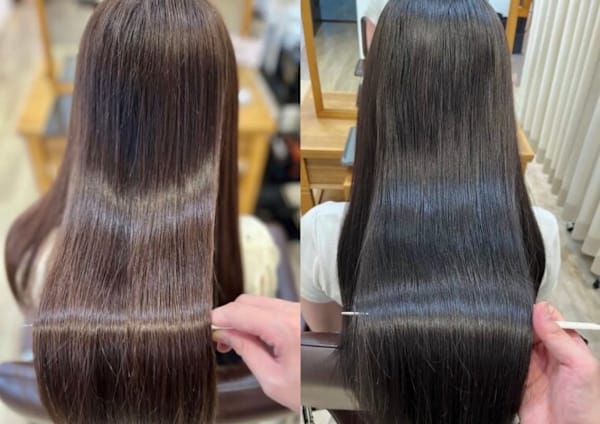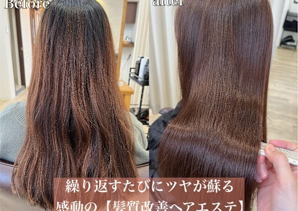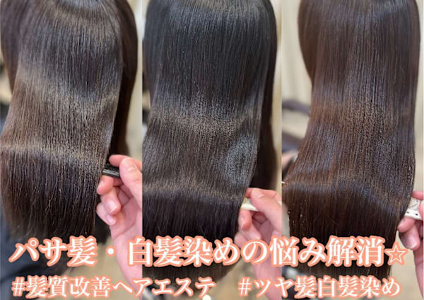 毎月のヘアカラー・白髪染め・パーマ・縮毛矯正で髪が乾燥・パサパサする・引っかかる・ゴワゴワする方が5年・10年後も髪を綺麗に保つことができる髪質改善です。今までの髪質改善とは違う。乾かしただけで髪が柔らかく、極上のツヤと手触りができ、お家でも同じように仕上がる髪質になります。 トリートメント/白髪