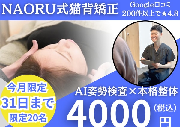 当院は単なるマッサージでの『その場しのぎ』では終わらせません。根本的な改善を目指し『あなた史上最軽の体』へとサポートします!長年当たり前にあった体の不調から脱却しませんか?姿勢のお悩み・慢性的な肩こり/腰痛をNAORUの本格整体・矯正で根本改善!他では満足できなかった方!期待以上をお約束します!