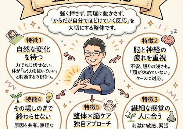 17年の経験と整体講師歴を活かし、緊張やコリに持続圧で丁寧にアプローチ。 骨を鳴らさず、安心して受けられる施術です。